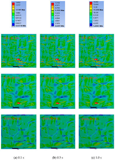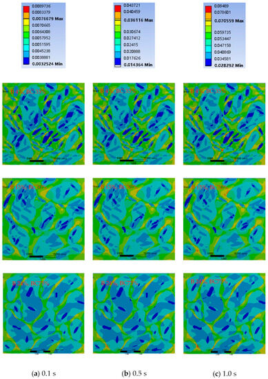 In analyzing Figure 5, it is evident that the stress of the bee phase is significantly higher than that of the bee casing. Furthermore, the interstitial phase experiences the lowest level of stress, which implies that in the event of an external load effect on the asphalt binder, the bee structure is more prone to stress concentration and early damage. As the bee phase and bee casing increase simultaneously, the corresponding force within the material becomes more pronounced, indicating that the aging of the asphalt binder leads to greater internal stresses, making it more susceptible to issues such as fatigue cracking. If the bee structure is considered as an aged asphalt binder, when the dosage of the old material is increased (less than the critical volume), the interfacial diffuse phase is also gradually increased, and the internal stress state of the asphalt binder is increased. The internal stress also increases gradually as the simulation time increases. The stress accumulation distribution curves of each component of the asphalt binder microstructure under a 1 s loading time when the bee phase increases at the same time as the bee casing are shown in Figure 7.