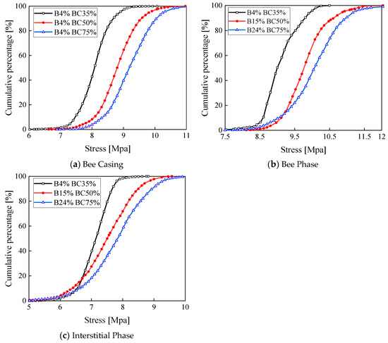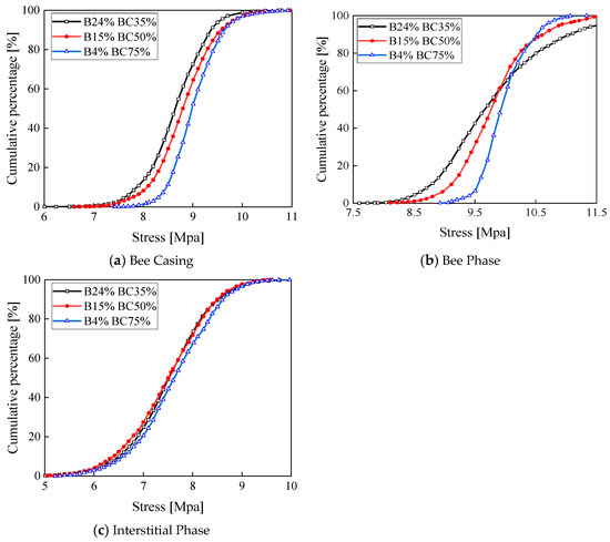 Stress cumulative distribution curves of asphalt samples with a reduction in bee phase contents and an increase in bee casing contents.