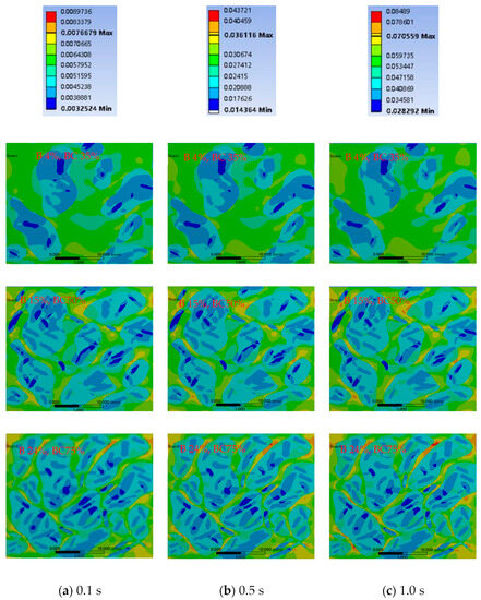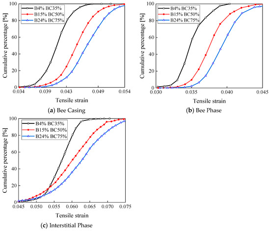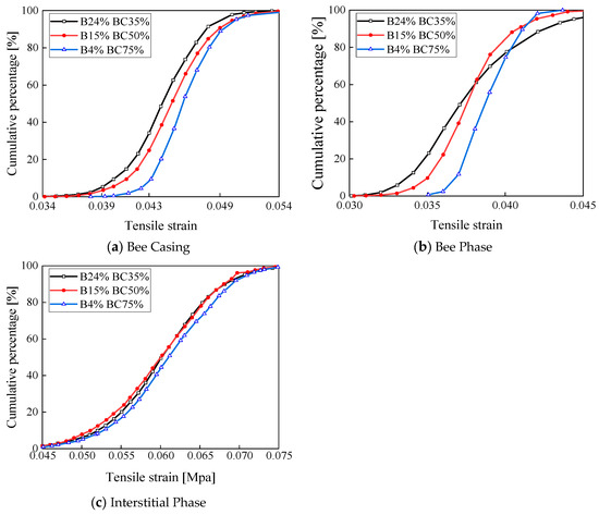 In Figure 9, the strains of all the three-phase systems of the asphalt binder gradually increase as the bee phase and the bee casing become larger. The overall total deformation remains constant due to the transformation of some of the interstitial phases into the bee phases and the bee casings. This indicates that the bee phases and the bee casings are better able to perform their roles in resisting external deformation due to the enhancement in the volume fraction. At the same time, the strain inside the asphalt binder increases gradually with the enhancement in the loading time. The cumulative distribution curves of the internal strains of the various phases of the bee structure under a 1 s loading time when the bee phase and the bee casing are increased simultaneously are shown in Figure 11.