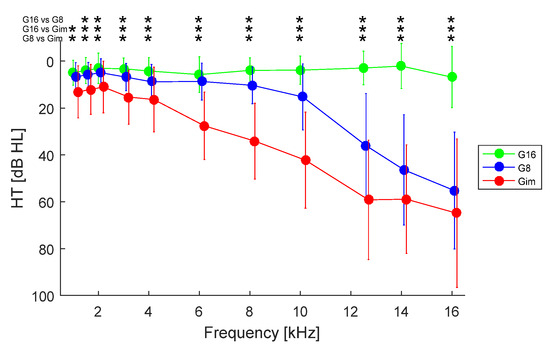 Average pure tone hearing thresholds (HTs) in test subjects divided into three groups according to hearing acuity: G16—thresholds equal to or better than 25 dB HL for all frequencies up to 16 kHz (green); G8—thresholds equal to or better than 25 dB HL up to 8 kHz (blue); and Gim—impaired, thresholds worse than 25 dB HL at one or more frequencies (red). Whiskers indicate standard deviations. Asterisks mark significant differences between groups.