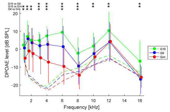 Average DPOAE response levels for all tested frequencies for the three groups—G16, G8, and Gim (as described in Figure 2). Dashed lines represent average noise levels for each group. Whiskers indicate standard deviations. Asterisks mark significant differences between groups.