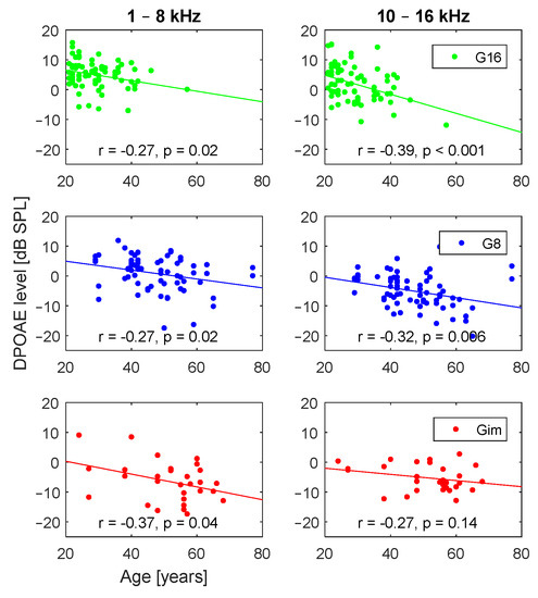 For each group, DPOAE response levels were correlated negatively with age, as can be seen in Figure 4. The correlations were weak to moderate. Even for the G16 group, the DPOAE response level decreased with age, despite the fact that hearing levels were within normal limits up to 16 kHz, and all ears presented generally high levels of DPOAEs. The effect of age was stronger for DPOAEs in the 10–16 kHz range compared to the 1–8 kHz range, with correlation coefficients of −0.37 and −0.27, respectively. Only for the Gim group in the 10–16 kHz range was there no significant correlation between DPOAEs and age (p = 0.14); nevertheless, the tendency for DPOAEs in that range to decline with age remained (r = −0.27).