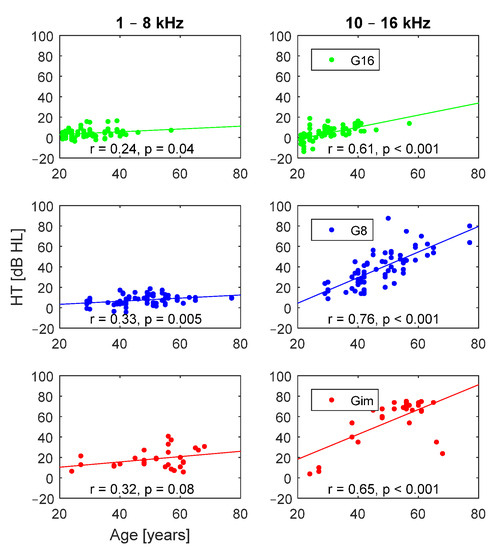 Similarly, HTs also increased with age, as shown in Figure 5. The correlations between HT and age were significant for all groups for EHFs (10–16 kHz), and for groups G16 and G8 for SFs (1–8 kHz), with Gim close to significance and having a similar trend to the other groups. For SFs, the correlations were weak to moderate, while for EHFs correlations were moderate to strong. The effect was especially pronounced for G8, where the correlation coefficient for EHFs reached 0.76.