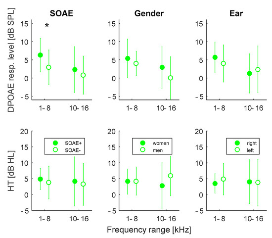 DPOAE response level and hearing threshold (HT) in group G16 when the group is split according to SOAE presence (SOAE+/SOAE–), gender (women/men), and ear side (right/left). Asterisk indicates a significant difference (p < 0.05).