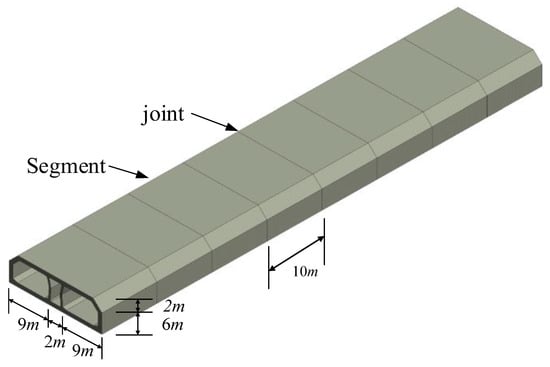 Different from bridges, immersed tunnels have their own unique advantages and have become an important method for crossing rivers and seas. It has become one of the key engineering projects for controlling the modern urban transportation network. Compared to other types of underground structures, immersed tunnels have a lighter weight, which could cause anti-floating problems. However, monitoring of existing projects has shown that immersed tunnels experience varying degrees of settlement during operation [1,2]. For example, the 1646 m long Fort McHenry Tunnel in the United States has a maximum settlement of 162 mm, and the Shanghai Outer Ring immersed tunnel has a maximum settlement of 310 mm. As a special type of underground building, the prediction of the stress, deformation, and riverbed settlement of an immersed tunnel caused by train operation has become a hot topic in civil engineering.