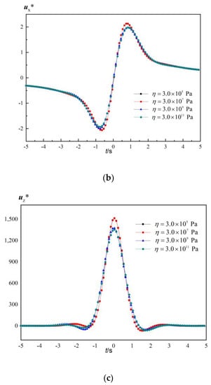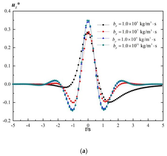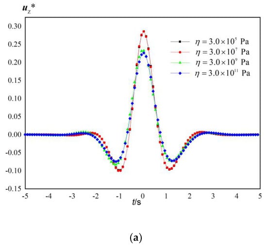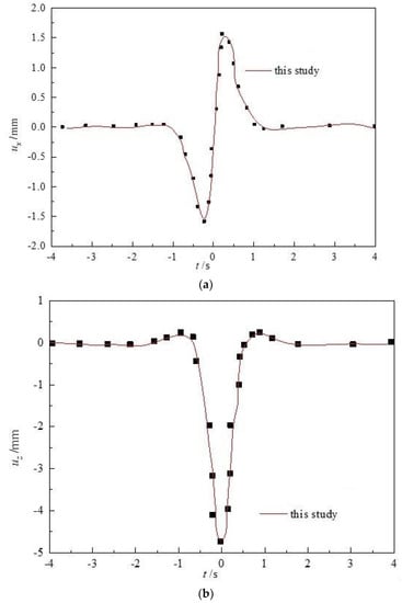 For comparison with the literature results, if the viscoelastic beam = = 2.0109, = 0.0 Pa, then the viscoelastic beam is fully elastic. In addition, when the saturated soil parameters , , M, , , are close to 0, the saturated soil can degenerate into elastic soil. A relatively simple two-dimensional model is considered [26], which consists of an elastic layer possessing a small viscosity and a beam located inside the layer. It is assumed that the layer is infinitely long in the horizontal direction, is fixed along the bottom, and has a traction-free surface. Figure 3 shows the depth of the riverbed as hw = 0.0, the buried depth of the tunnel as H = 7.0 m, and from the riverbed bedrock, hs = 15.0 m, moving point load as Fz = 1.0 × 104 N·m−1, speed = 30.0 ms−1, the vertical and horizontal displacement of the riverbed surface observation point A (0.0 m, 0.0 m) changes with time t, and the calculation results of homogeneous elastic soil-beam conditions are given in the literature [26].