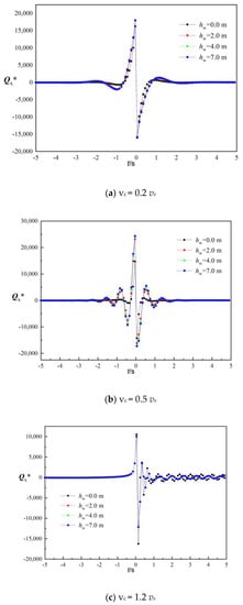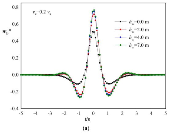 From Figure 7 and Figure 8, the vertical, horizontal displacement, and hole pressure of the observation point increase as the water depth of the riverbed increases, and the existence of the riverbed water makes the vibration of the observation point more significant, indicating that when the load speed is small, such as vc = 0.2 vs, the vertical and horizontal displacement of the temporal dynamic response of the observation point is basically symmetrically distributed on both sides of the moment of load arrival. With increasing load speed and displacement amplitude, the longer the vibration time of the observation point in the riverbed foundation, the more its symmetry about the moment of load arrival disappears. And the phenomenon of shock waves appears. Compared with the vertical and horizontal displacement when the moving load is about to reach the observation point t < 0 and when the load leaves the observation point t > 0, it shows that when the load is about to reach the observation point t < 0, the vibration wave frequency at the surface observation point of the soil is higher. But with a smaller amplitude, Presented as the Doppler effect, that is, when the load approaches the observation point, higher-frequency vibrations will occur. The further the load is away from the observation point, the lower the vibration frequency. But the amplitude of the vibration wave is just opposite to the law of the vibration frequency.