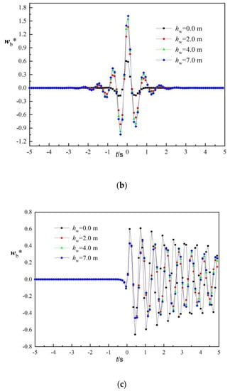 Vertical displacement change of the structural beam of the underwater immersed tunnel during different riverbed water depths. (a) vc = 0.2 vs, (b) vc = 0.5 vs, (c) vc = 1.2 vs.
