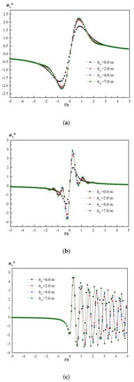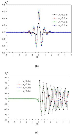 Horizontal displacement change of riverbed foundation observation point A (0.0 m, 2.0 m) at different riverbed water depths. (a) vc = 0.2 vs, (b) vc = 0.5 vs, (c) vc = 1.2 vs.