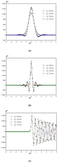 Change of hole pressure at the observation point of the riverbed foundation during different riverbed water depths. (a) vc = 0.2 vs, (b) vc = 0.5 vs, (c) vc = 1.2 vs.