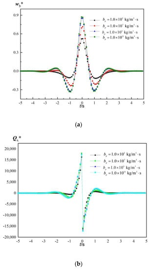 Figure 12 and Figure 13 show that as the viscosity coefficient of the Euler beam of the tunnel structure through the river increases, the vertical displacement, shear force, and vibration amplitude of the bending moment of the beam decrease, but when the viscosity coefficient of the beam increases, such as = 3.0 × 109 Pa, which has little influence on the vertical displacement, shear force, and vibration amplitude of the bending moment, it indicates that the elastic modulus of the viscoelastic Euler beam doesn’t change with the calculation frequency and shows plasticity. Therefore, the standard solid model of a viscoelastic beam can better describe the creep and relaxation of the material.