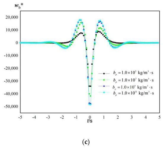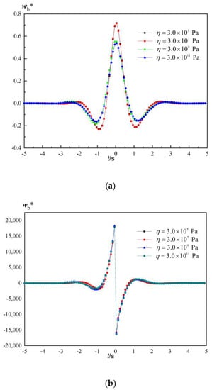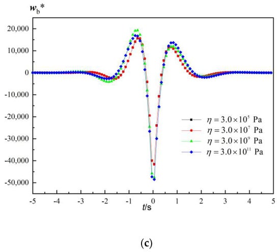In the case of the viscosity coefficient of different viscoelastic beams: = 3.0 × 105 Pa, 3.0 × 107 Pa, 3.0 × 109 Pa, 3.0 × 1011 Pa, = = 2.0 × 109 Pa, the load speed , = 2.0 m, the calculation parameters of other saturated riverbed soil are the same as in Example 2. The elastic modulus and viscoelastic coefficient of the viscoelastic beam affect the displacement, shear, and bending moments of the tunnel structure beam and the displacement and pore pressure change of the soil internal observation point (A (0, 2.0 m)), as shown in Figure 12 and Figure 13.