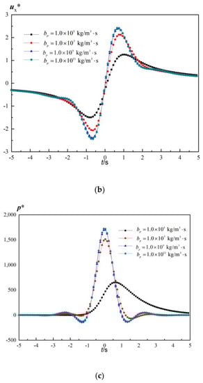 From Figure 10 and Figure 11, with the increase in the bp value of the saturated foundation (enhanced soil permeability), the vertical displacement, bending moment, shear force of the tunnel structure beam, the vertical and horizontal displacement, and the hole pressure of the observation point increase. However, when the bp value of a saturated foundation increases to a certain value , it has little influence on the vertical displacement, bending moment, shear force of the beam, vertical and horizontal displacement, and pore pressure of the observation point. The soil with poor permeability produces large pore pressure under the action of a load.