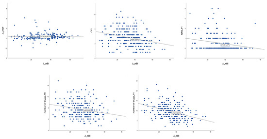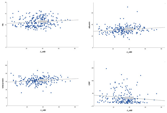 Regarding the correlation between Δ_mBI and the blood sample values, we found a positive correlation with Hb (p = 0.010, ρ = 0.161), with albumin (p = 0.001, ρ = 0.215), with total protein (p < 0.001, ρ = 0.228), and a negative correlation with CRP (p = 0.003, ρ = −0.210) (Figure 2).