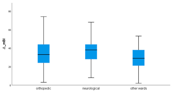 Observing the single groups of our sample, we calculated the medians and interquartile ranges of Δ_mBI: for the orthopedic group, it was 33 (24–44); for the neurological group, it was 38 (28–44); and for the inpatients coming from the other hospital wards, it was 29 (21–38) (Figure 3).