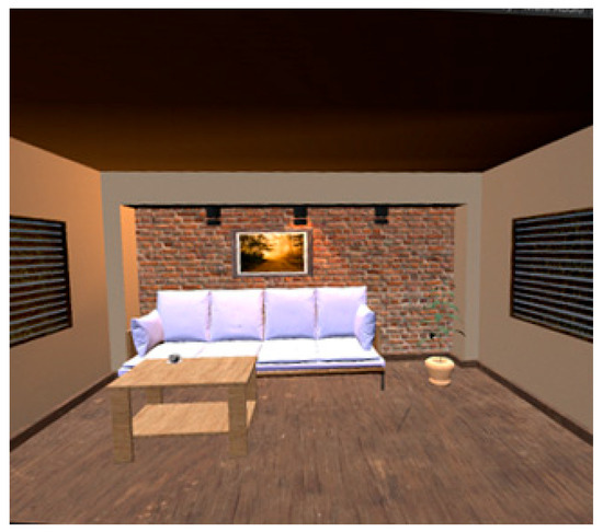 The measurement stand consisted of a Zebris WinFDM-S stabilographic platform (100 Hz sample frequency, 2560 tensiometer sensors, 34 cm × 54 cm sensing area), and a set of the HTC Vive Cosmos head-mounted display (HMD) used for the projection of three-dimensional images. Three-dimensional sceneries were developed in the Unity 3D environment. Scenery consisted of a furnished room, in which objects were seen by the tested individual at a distance of ~2 m (Figure 1). Data from the Zebris FDM pressure distribution measurement system were gathered using the Noraxon Ultium™ system. During the tests, the scenery oscillated in the sagittal plane at a constant frequency. Oscillations were presented by moving the scenery along the sagittal axis, taking into consideration a slight rotation of the scene by 0.5 degrees. The movement of the scenery was achieved by overlapping the following two movements, and was based on data presented in [6]: