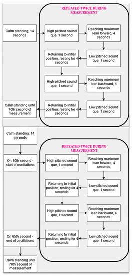The subjects were asked to take off their shoes and stand on the measuring platform in an upright position with their arms along their body and their vision focused on a point located in front of them at a distance of ~2.5 m, at the approximate height of their eyes. The order of conducted tests was randomized. The task of the tested person was to stand still, lean out, and return to an upright position after hearing the appropriate sounds. The first type of sound was high-pitched, and after hearing it the tested person leaned forward/backward without lifting their heels/toes off from the ground. After 5 s, the second, low-pitched sound was played, after hearing it, the participant was supposed to return to the starting position. Each measurement lasted 70 s and included four leans—two forward and two backward. The same procedure was used for each of the previously described test conditions. Schemes of measurements performed with and without oscillations are presented in Figure 2.