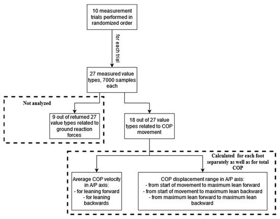 From the Zebris FDM-S platform, 27 value types were recorded, and each gave 7000 registered samples. From those 27 values, all A/P axis COP-related values for the left and right foot separately, as well as the total between both feet were taken into further consideration.