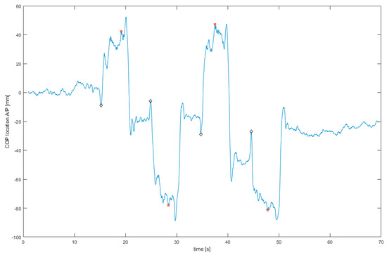 Exemplary COP displacements registered during measurement with use of VR and scenery oscillations at 0.2 Hz. Black rhomboids represent points of leaning start, red stars are points of registered maximums during leaning.