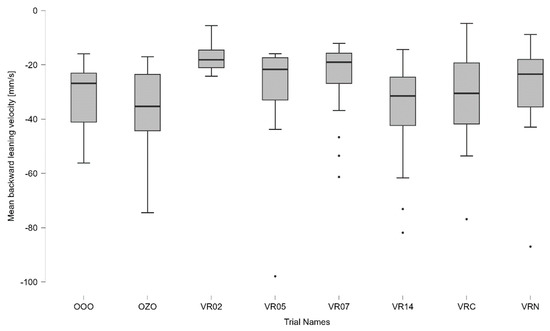 Statistics for differences in mean COP velocities of leaning backward between all trials, averaged for all participants. Top and bottom lines of boxes represent 25th and 75th quartile, the thick line represents the mean value, and whiskers are the standard deviation. Dots represent the outliers.