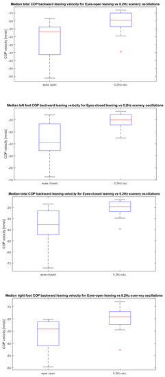- Median left foot COP backward leaning velocity for eyes-closed leaning vs. 0.2 Hz scenery oscillations;