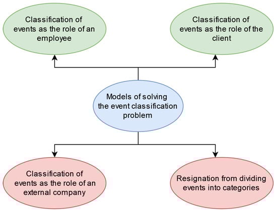 In the model of the classification of events as an employee’s role, the responsibility for classifying an event lies with the company, more specifically with its employees. In this model, the customer informs the head office of the company’s customer service office about his event by using a clearly defined communication path through the organization (phone call, email, etc.). Then, a customer service employee analyzes the request and, sometimes consulting with colleagues, decides which branch or department of the company should deal with the specific request. Then, things can go in two ways: