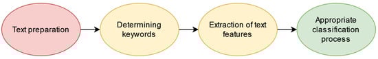 This section consists of a description of the text-classification process that was implemented in the Text Events Categorizer system. The order of discussing the stages of the classification process is consistent with the actual order of performing individual activities and algorithms: (1) the preparation of texts; (2) determining the keywords; (3) the process of feature extraction; and (4) classification, using for example the K-Nearest Neighbors algorithm (Figure 2).