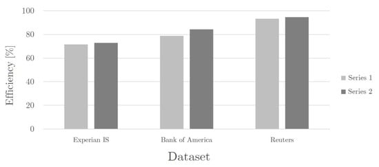 The Figure 8 clearly shows that each of the experiments in Series 2 yielded a higher classification efficiency value than the corresponding experiment in Series 1. The difference between the calculated values ranges from for the set to less than 6% for the set. For each set, the difference in the classification efficiency for the Series 1 and Series 2 experiments is therefore noticeable.