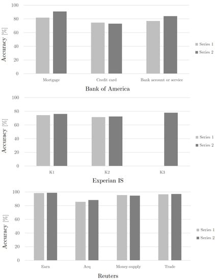 - The accuracy metric values are greater for the Series 2 experiments in most cases. The differences range from almost for the Mortgage category in the set in favor of the Series 2 study to less than for the Credit Card category and also in favor of the Series 1 experiment. Only in the case of two categories was a higher measure of accuracy obtained for the Series 1 experiments—in addition to the already-mentioned Credit Card category for the set, this was also the case for the money supply for the set.
