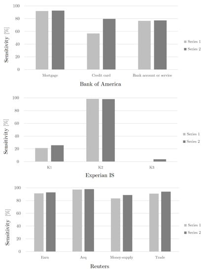 - The values of the sensitivity measure are higher for the studies from Series 1 in all cases, except for the category for the set. The record difference in favor of the experiment from the second iteration was obtained for the Credit Card label from the set—less than .