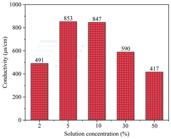 In this study, deionized water and ethanol were chosen as solvents for the hydrolysis reaction of SCA. In addition, to determine the optimal concentration of SCA, conductivity was chosen as a measure to assess the effect of concentration on the degree of SCA hydrolysis. This is because the conductivity of SCA and deionized water is very low, while the conductivity of the hydrolysis products of SCA is high. In addition, in the solution proportioning, there is no effect on the conductivity of the system because ethanol always makes up 50% of the total solution volume in the solution proportion. Therefore, the degree of hydrolysis of the SCA can be confirmed through conductivity measurements. As shown in Figure 1, the conductivity increased significantly when the SCA concentration was increased from 2% to 5%. However, as the SCA concentration continued to increase, the conductivity did not increase; instead, it showed a decreasing trend. The results indicate that the hydrolysis of SCA is highest when the concentration of SCA is 5%. Therefore, the optimal ratio of the SCA mixture solution is SCA:deionized water:ethanol = 5:45:50.