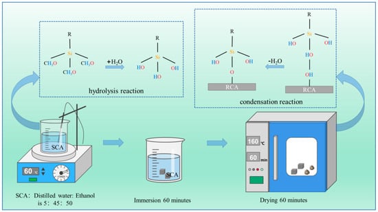 The RCA treatment method and modification mechanism are shown in Figure 2. First, the SCA mixed solution (SCA:distilled:ethanol = 5:45:50) was stirred at 60 °C for 30 min to promote the hydrolysis reaction of SCA. Then, the RCA was immersed in an SCA mixture for 30 min to ensure a sufficient reaction between the SCA and RCA. Finally, the RCA was dried at a high temperature of 160 °C for 60 min to undergo a dehydration condensation reaction. During the entire process, the methoxy group (−OCH3) in the molecular structure of SCA (KH550) can hydrolyze into the alkoxy group (−SiOH) of silanol in a mix of ethanol and water. Then, under high temperature conditions, the alkoxy group undergoes a dehydration condensation reaction with the hydroxyl group on the RCA surface to form Si-O-Si bonds [].