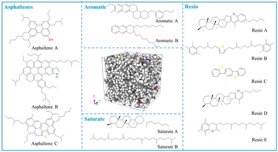Asphalt is a residual petroleum mixture composed of hydrocarbons, sulfur and nitrogen compounds, and their non-metallic derivatives. These molecules have significant differences in polarity and molecular weight, making it difficult to represent their composition with a single molecule. In order to understand the molecular structure of asphalt, Jennings et al. constructed an average molecular structure based on the nuclear magnetic resonance (NMR) spectra of eight asphalt samples from the Strategic Highway Research Program (SHRP) in the United States. However, these structures cannot reflect the interactions between asphalt components. Subsequently, the asphalt system was divided into four components: saturates, aromatics, resins, and asphaltenes (SARA) using the standard test method (ASTM D4124-09 []). Through continuous improvement, Li and Greenfield constructed three 12-component asphalt models (AAA-1, AAK-1, and AAM-1) based on the SARA components. Therefore, in this study, the AAA-1 asphalt 12-component model was selected as a representative of the matrix asphalt for research. Figure 3 shows the molecular structure of the 12-component asphalt model. Figure 4 shows the model parameters of the 12-component asphalt model.