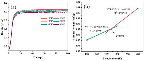 In this study, the density and glass transition temperature (Tg) of the asphalt model were computed to verify the accuracy of the model. In this case, the density of asphalt was calculated using the isobaric–isothermal ensemble (NPT) at 1 atm pressure. As shown in Figure 5a, when the simulation time is greater than 30 ps, the density curve of the asphalt model tends to stabilize, so we calculated the average density of the asphalt model from 50 to 100 ps. From the analysis of the asphalt density curve, it can be concluded that the density of asphalt after equilibrium at 298 K is 1.02 g/cm3. The experimental density value of SHRP AAA-1 asphalt is 1.01–1.04 g/cm3, which is consistent with the density of the asphalt model.