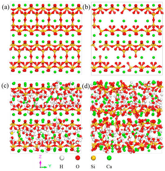 For cement mortar adhered to RCA surfaces, C-S-H accounts for about 60–70% of the hydration products and is the main component and strength source of the hydration products [,]. In this study, a C-S-H model was established based on the method proposed by Pellenq et al., as shown in Figure 6. The specific steps are as follows: (1) Tobermorite 11 was used as the initial model. After removing the water molecules of the initial model, a 4 × 3 × 1 supercell simulation was performed, and the monoclinic structure was changed to an orthorhombic one (Figure 6a); (2) To get the silicate chains to satisfy Q1 = 11.63%, Q2 = 67.44%, Q3 = 20.93%, and Ca/Si = 1.67, some SiO2 groups and Si2O5 groups were randomly removed from the silicate chains (Figure 6b); (3) The adsorption of water molecules to saturation was achieved using the grand canonical Monte Carlo (GCMC) method (Figure 6c); (4) To achieve equilibrium of model, the relaxation was continued under the NPT system (Figure 7d). Finally, the dimensions of the C-S-H model are 22.32 Å × 22.17 Å × 22.77 Å. The density (2.45 g/cm3) of the constructed model is close to the results obtained from previous simulations or experiments, indicating that the model is reasonably valid [,].
