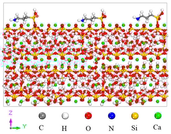 Figure 7 illustrates the establishment of the SCA/C-S-H model. Firstly, the C-S-H model 2 × 2 × 1 supercell simulation was performed. Then, based on the SCA and cement mortar binding mechanism, the hydrolysis products of SCA were connected to the non-bridging oxygen atoms of the C-S-H matrix through Si-O-Si chemical bonding. The dimensions of the SCA/C-S-H model are 44.64 Å × 44.34 Å × 24.86 Å.