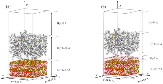 In this study, all simulations were performed using the Materials Studio 2020 software, and the COMPASS force field was selected to investigate the interaction mechanism of the C-S-H/asphalt interface. Taking the unmodified C-S-H model as an example, the asphalt/C-S-H interface model is shown in Figure 8a. For the placement of C-S-H and asphalt in the same simulation box, the dimensions of the C-S-H and asphalt models need to match in the x and y directions. Therefore, the asphalt model was first created with dimensions of 44.64 Å × 44.34 Å × 27.35 Å in the x, y, and z directions and subjected to 50,000 steps of geometry optimization. Next, the C-S-H model was expanded to a 2 × 2 × 1 supercell with lattice parameters: a = 44.64 Å, b = 44.34 Å, and c = 22.17 Å. Then, the C-S-H/asphalt interface model was established, and a 30 Å vacuum layer was added above the asphalt layer to eliminate periodic boundary effects. As shown in Figure 8b, based on the C-S-H/asphalt interface model, the influence of water on the interface bonding was studied by inserting a 2 Å water layer between the C-S-H and asphalt layers. Finally, each interface model was relaxed for 500 ps under the canonical (NVT) ensemble, and the interface properties were analyzed using the trajectory from the last 100 ps.