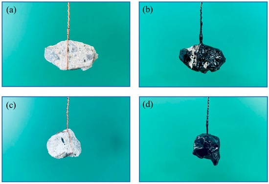The boiling water test is a commonly used method to test the adhesion performance of asphalt to aggregate surfaces and evaluate the aggregate’s resistance to water stripping. According to ASTM D36-25 [] and the Chinese boiling test, the specific steps of the experiment are as follows. First, tie the RCA with wire and place it in a 105 °C drying oven to dry. Then, immerse the dried RCA in asphalt at 140 °C for 45 s, remove it, and cool it at room temperature for 15 min. Finally, immerse it in boiling water for 3 min, remove it, and observe the degree of asphalt film peeling on the surface of the RCA to evaluate its adhesion grade according to Table 4.