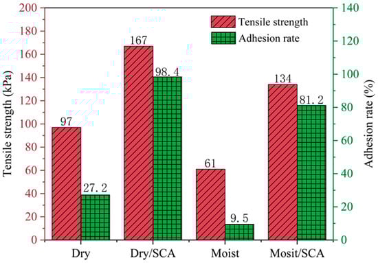 The tensile strength of the interface and adhesion rate of asphalt on RCA surface.