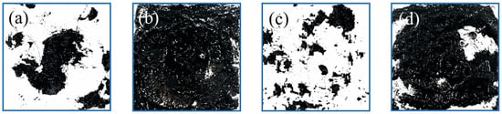 The fracture surface of RCA after binarization: (a) no modification under dry conditions; (b) SCA modification under dry conditions; (c) no modification under moist conditions; (d) SCA modification under moist conditions.