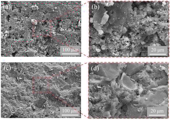 The surface microstructure of the RCA is shown in Figure 12. The results indicate that the surface porosity of the RCA is repaired after SCA modification, resulting in a tighter bond between the RCA and the interface. In terms of the surface microstructure of the RCA, without SCA modification, there are a large number of mortar pores on the RCA surface, which is the main reason for the high water absorption and poor adhesion performance of the RCA to asphalt. After SCA modification, the mortar pores of the RCA surface are significantly reduced. The reason for the reduction in surface pores of the RCA is that SCA first undergoes hydrolysis to form silanol, which then undergoes a condensation reaction with the hydroxyl groups on the cement mortar surface, resulting in the coverage of the cement mortar surface with alkyl-terminated siloxane, forming chemical adsorption.