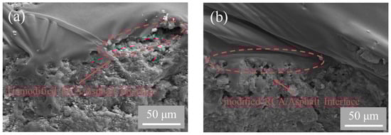The interface microstructure of the RCA/asphalt is shown in Figure 13. In terms of the interface structure between the RCA and asphalt, without SCA modification, the presence of a large number of pores on the RCA surface leads to defects in the RCA/asphalt interface structure. After SCA modification, the bond between the RCA and asphalt interface becomes denser. This is mainly because one end of the hydrolysis product of SCA is tightly adsorbed on the RCA surface, while the organic functional groups extend into the asphalt, tightly connecting the RCA and the asphalt. It acts as a “molecular bridge” between the RCA and asphalt interface, tightly connecting the RCA and asphalt together and improving the interface properties between the asphalt and RCA.
