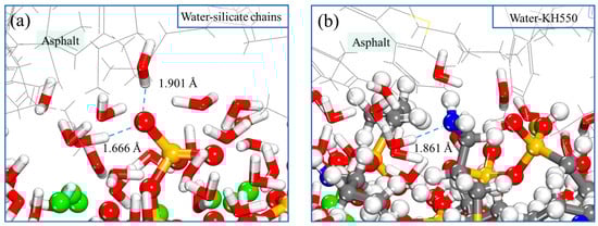 The number of hydrogen bonds formed between C-S-H and interfacial water is shown in Figure 15. The results indicate that there are fewer hydrogen bonds between C-S-H and interfacial water after SCA modification. Specifically, unmodified C-S-H forms 213 hydrogen bonds with interfacial water. The more hydrogen bonds form between C-S-H and interfacial water, the stronger the hydrophilicity of the C-S-H surface. Due to the hydrophobic nature of asphalt, stronger hydrophilicity of the C-S-H surface leads to weaker adhesion between asphalt and the C-S-H. After SCA modification, the number of hydrogen bonds at the C-S-H interface decreases by 19.7%, indicating a decrease in the hydrophilicity of the C-S-H surface after SCA modification, thereby enhancing the interaction at the asphalt/C-S-H interface. This is mainly because the C-S-H surface is composed of silicate chains and calcium ions, which have strong hydrophilicity. After SCA modification, the distance between interfacial water and the C-S-H surface is increased, thereby reducing the formation of hydrogen bonds and decreasing the hydrophilicity of the C-S-H surface. Compared to the previous SCA-modified SiO2 interface, the SCA modification can be very effective in reducing the hydrophilicity of both SiO2 and C-S-H surfaces, thus improving the effect of water molecules on the aggregate/interface []. The results show that SCA modification has a positive effect on enhancing the water damage resistance of the aggregate/asphalt interface.