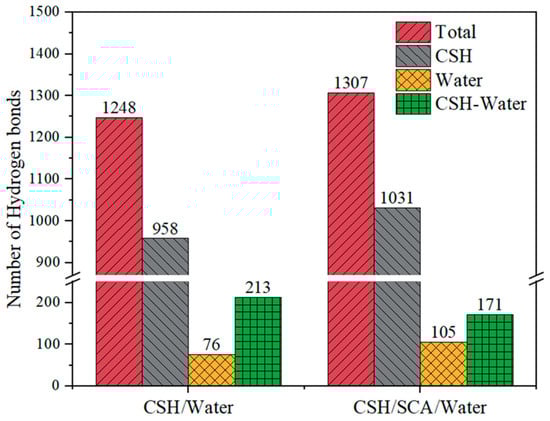 In this study, we primarily calculated the number of hydrogen bonds formed between interfacial water and the C-S-H surface to investigate the effect of SCA alteration on the hydrophilicity of the C-S-H surface. As shown in Figure 14, the hydrogen bonds at the interface mainly form between water molecules and the silicate chains, as well as between water molecules and SCA.