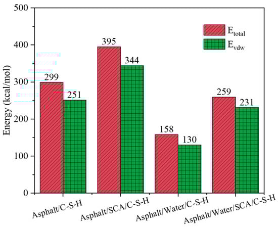 The interaction energy between C-S-H and asphalt is shown in Figure 16. The results indicate that SCA modification can increase the interaction energy of the interface under both dry and wet conditions. Under dry conditions, the interface interaction energy of the SCA modification increased by 32.1%. This increase is attributed to the ability of SCA modification to alleviate the harmful effects of Ca ions and water molecules on the C-S-H surface, thereby improving the interaction energy of the interface. Under wet conditions, the interaction energy of the interface decreased by 47.15%. This is primarily due to the fact that the interaction energy of the interface is mainly governed by van der Waals forces, and the presence of water at the interface increases the distance between the asphalt and C-S-H interface, resulting in a 48.2% reduction in van der Waals forces. Consequently, the interaction energy of the interface decreases. In comparison, the SCA modification under wet conditions showed a 63.9% increase in interaction energy compared to the unmodified interface. This indicates that SCA modification can effectively enhance the water resistance of the interface. This is because SCA modification reduces the hydrophilicity of the C-S-H interface, diminishing the impact of water molecules on the interface performance and consequently increasing the interaction energy at the asphalt and C-S-H interface.