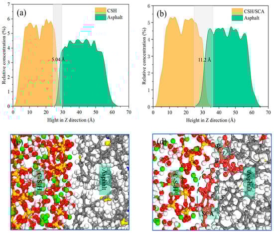 The thickness of the interface transition zone and interface structure for the C-S-H/asphalt interface are shown in Figure 17. It can be seen that SCA modification has an important impact on the transition zone thickness and interface structure. For the unmodified interface, the thickness of the transition zone is 5.04 Å. This may be due to the diffusion of water molecules in C-S-H into the area near the surface of the asphalt, where the water molecules overlap with the asphalt molecules. After SCA modification, the thickness of the transition zone increased from 5.04 Å to 11.2 Å, indicating that SCA modification enhanced the attraction of the C-S-H surface to asphalt. Moreover, two distribution patterns of SCA molecular chains on the C-S-H surface can be observed at the interface structure between C-S-H and asphalt: one is parallel to the C-S-H surface, and the other is inserted into the asphalt layer. The insertion of SCA molecular chains into the asphalt layer is strongly entangled with asphalt molecules, thereby enhancing the weak interface transition zone between C-S-H and asphalt.