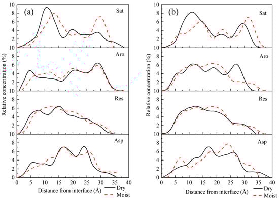 The concentration profiles of SARA components: (a) C-S-H/water/asphalt model; (b) C-S-H/SCA/water/asphalt model.