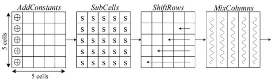- Guo, J.; Peyrin, T.; Poschmann, A.; Robshaw, M. The LED block cipher. In Proceedings of the 13th International Conference on Cryptographic Hardware and Embedded Systems, Nara, Japan, 28 September–1 October 2011; pp. 326–341. [Google Scholar]