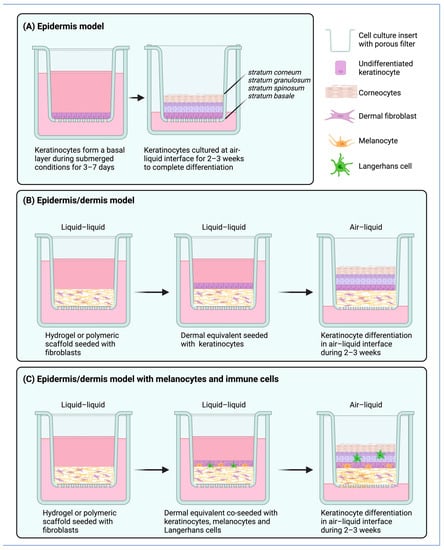 To establish and propagate cells in an ALI culture, epithelial cells are seeded in compartmentalized systems on porous filter supports under submerged conditions for 3–7 days []. After an initial attachment, proliferation phase, and formation of a confluent monolayer, the apical medium of the epithelial cells is removed. The cells “interface” with the surrounding air, differentiating and generating an apical microenvironment []. Since the basal surface of the cells has access to the culture medium, its nutrients and other additives can nourish cells via diffusion through the porous membrane. The full differentiation of the in vitro structure is completed in approximately 2 weeks [,] (Figure 1A). The different barrier functions of human skin and their role in maintaining tissue homeostasis are important to understand when designing 3D reconstructed skin models [,]. The epidermis is the outer compartment of the skin, and it contains keratinocytes, which comprise around 95% of all the cells in the epidermis []. These cells are essential for epidermis development as they differentiate and migrate upward to create four strata that facilitate skin barrier function [,]. The stratum basale is the bottom layer of the epidermis and is responsible for constantly renewing the cells of the epidermis. This layer contains just one row of undifferentiated epidermal cells, known as basal keratinocytes, that divide frequently [].