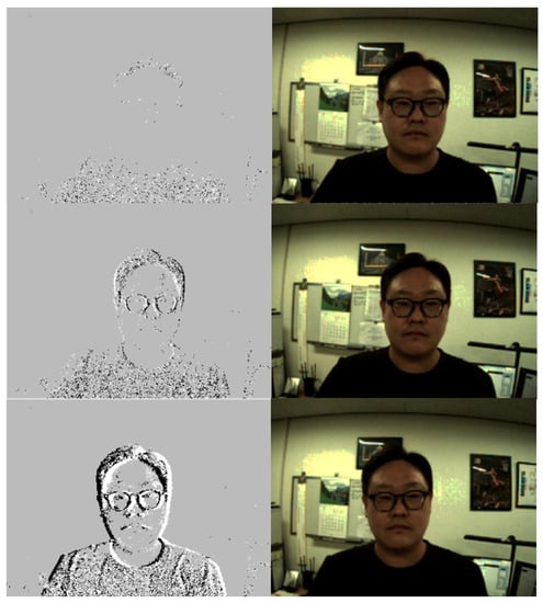 To evaluate the performance of event camera-based pupil tracking, we conducted comprehensive experiments using a diverse dataset that includes various eye movement scenarios and lighting conditions. We compared the results obtained from our proposed event-camera-based method with our previous frame-based eye-tracking algorithms []. The experimental results convincingly showcased the potential of event camera imaging in significantly enhancing the accuracy and robustness of pupil tracking, especially during rapid eye movements. Our proposed method was implemented using C++ and tested solely based on CPU computations on a Windows PC. Remarkably, the algorithms achieved an impressive speed of 200 frames per second at a 640 × 480 resolution with a 2.0 GHz CPU, showcasing their real-time capabilities and practical suitability for various applications. Table 1 summarizes the pupil-tracking specification. The eye–nose detection uses a cascaded Adaboost classifier combined with multiblock LBP, incorporating nine boosting substages. For pupil localization, the aligner adopts an SDM-based 11-point eye–nose-alignment technique that integrates SIFT features through a 4-step regression. These predefined 11 points include the left eye’s outer and inner corners, its center; the right eye’s outer and inner corners, its center; and the nasion, pronasale, left alare, subnasale, and right alare. We assessed the precision of our algorithm by computing the disparity between the ground truth and the tracked pupil centers. This method provides a direct quantitative measure of the algorithm’s performance by identifying how closely our tracking aligns with known truth values. To relate these disparities to real-world measurements, we utilized the inter-pupil distance (IPD) as a reference. Assuming an IPD of 65 mm, which is a general average for adults, we converted pixel distances into physical distances, enabling us to accurately estimate the positions of the pupils in real-world units. Consequently, our event-camera-based pupil-tracking method achieved a detection accuracy of 98.1% and a tracking accuracy (pupil precision < 10 mm) of 80.9%. The detection accuracy was on par with existing RGB-frame-camera-based pupil-tracking methods, while the tracking accuracy, though slightly lower than frame-camera-based algorithms, proved reasonable and promising for an initial exploration of event-camera-based pupil tracking. A summary of these results is provided in Table 2.